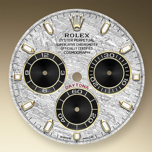 Hour, minute, and second hands in the center, with small seconds (at 6 o’clock). Chronograph and totalizer measuring up to 1/8 second (30 minutes at 3 o’clock and 12 hours at 9 o’clock). Accurate time setting with second hand stop function