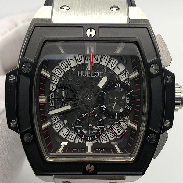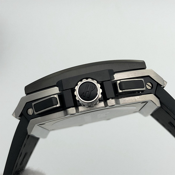 Bezel: Satin-finished, polished, microblasted black ceramic with 6 H-shaped titanium screws